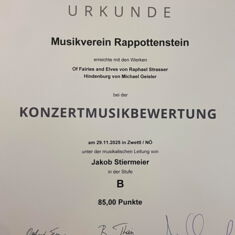Am 29. November nahm der Musikverein Rappottenstein an der Konzertmusikbewertung im Zwettler Stadtsaal teil und stellte sich in der Schwierigkeitsstufe B (Wertungsstufen von A sehr leicht bis E sehr schwierig) den kritischen Ohren der Bewerter. Bewertungskriterien sind unter anderem Intonation, Zusammenspiel und musikalischer Gesamteindruck. Mit dem Pflichtstück „Of Fairies and Elves“ von Raphael Strasser und dem Selbstwahlstück „Hindenburg“ von Michael Geisler wurde eine tolle Leistung von 85 Punkten erzielt.