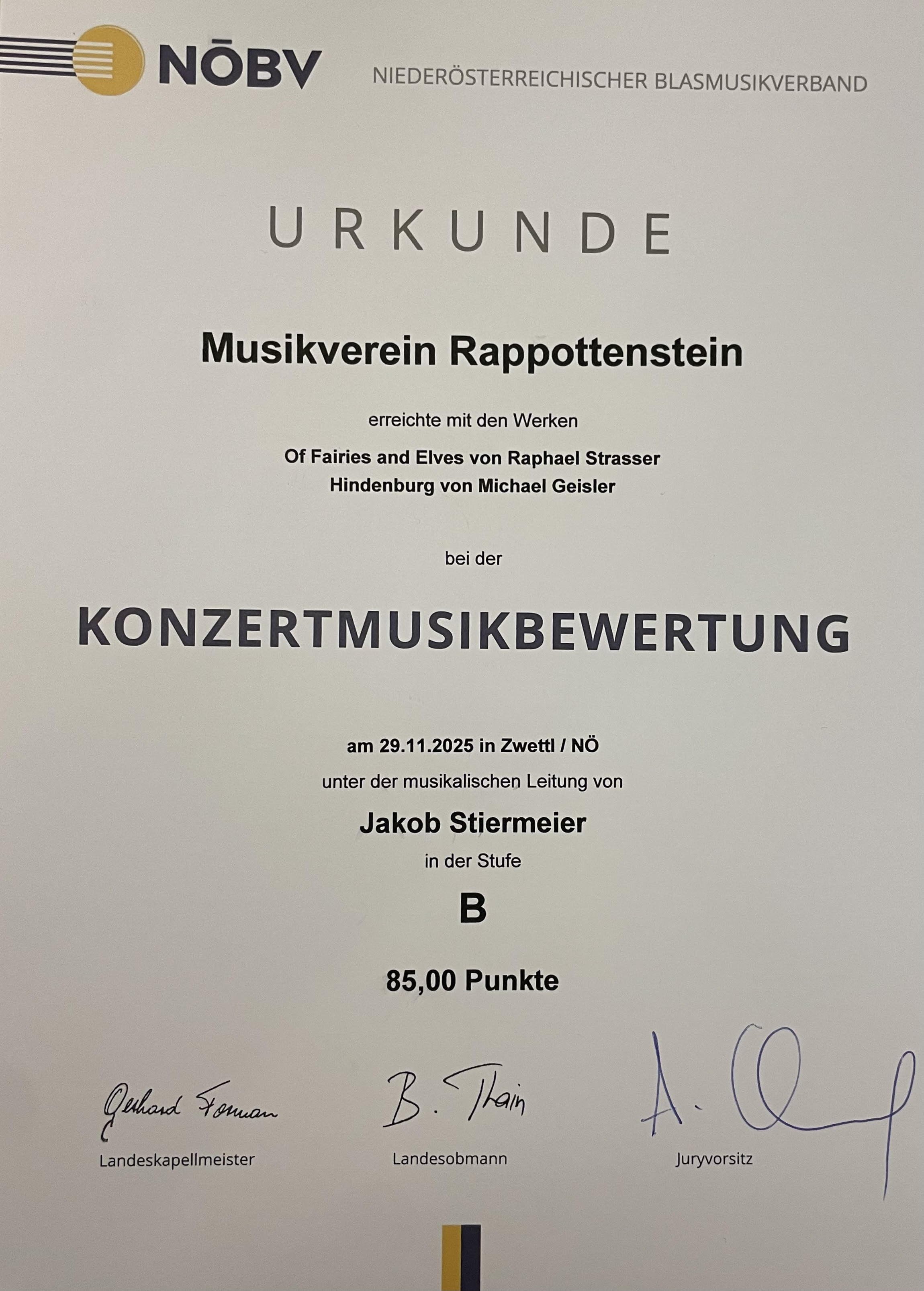 Am 29. November nahm der Musikverein Rappottenstein an der Konzertmusikbewertung im Zwettler Stadtsaal teil und stellte sich in der Schwierigkeitsstufe B (Wertungsstufen von A sehr leicht bis E sehr schwierig) den kritischen Ohren der Bewerter. Bewertungskriterien sind unter anderem Intonation, Zusammenspiel und musikalischer Gesamteindruck. Mit dem Pflichtstück „Of Fairies and Elves“ von Raphael Strasser und dem Selbstwahlstück „Hindenburg“ von Michael Geisler wurde eine tolle Leistung von 85 Punkten erzielt.